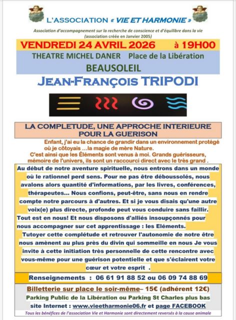 |  Vendredi 24 Avril | Le vendredi 27 Mars à 19h au Théâtre Michel Daner à Beausoleil Nous aurons le grand plaisir de recevoir Vendredi 24 Avril à 19h00 au Théâtre Michel Daner à Beausoleil, Jean François Tripodi, Énergéticien qui nous parlera des 4 éléments et de nos possibilités personnelles pour notre guérison... Vous pourrez prendre votre place directement au théâtre le soir même. Merci par avance pour votre présence et pour vos partages autour de vous ! |